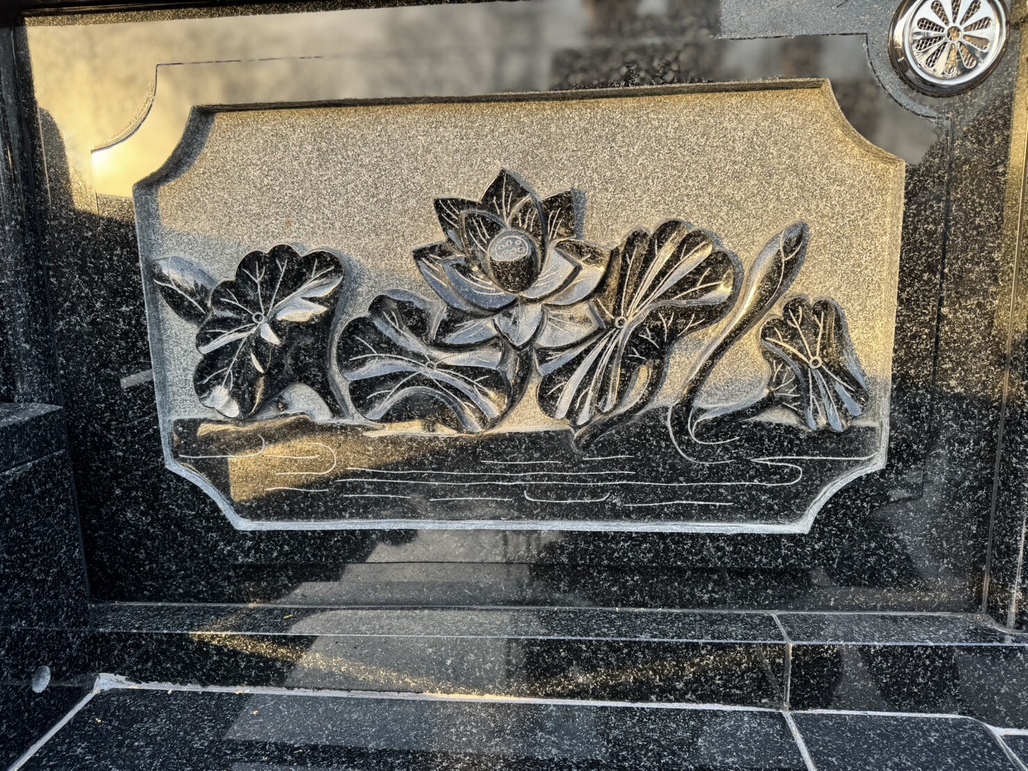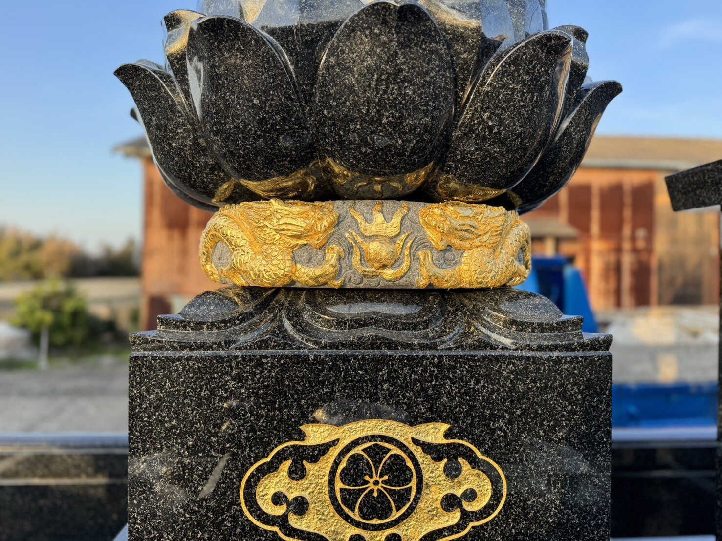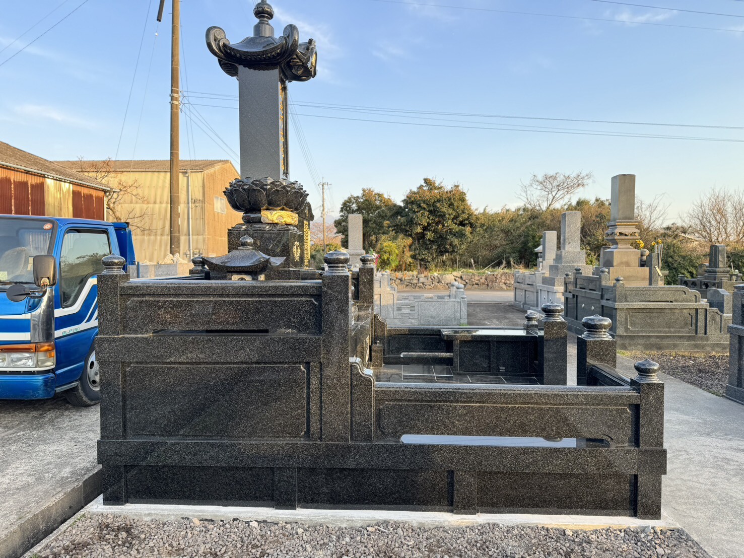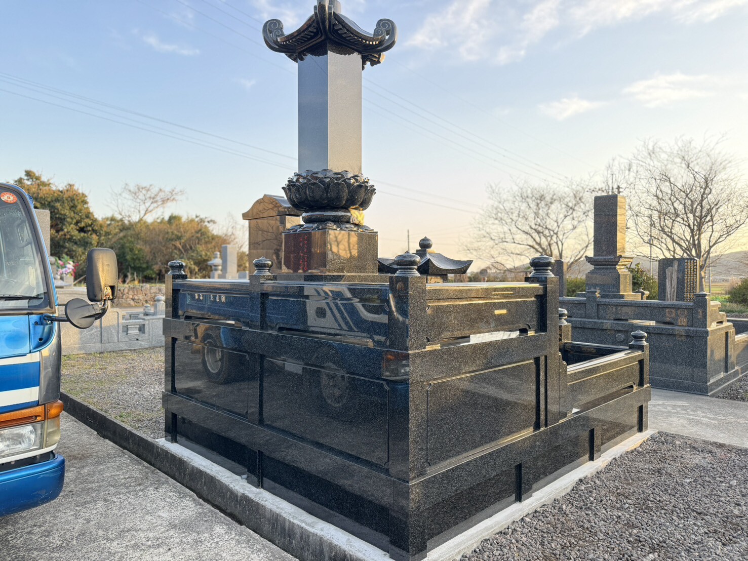 この度、諫早市森山町にて、お墓の新設工事をさせていただきました。広さは3m×3.5mのゆとりある墓所。石種はインド産の高級御影石「RYO」を使用し、格式ある大名笠付き墓石、そして丸蓮華・龍の彫刻・扉横の連(れん)3D彫刻まで細部にこだわった、重厚感と芸術性を兼ね備えたお墓が完成いたしました。